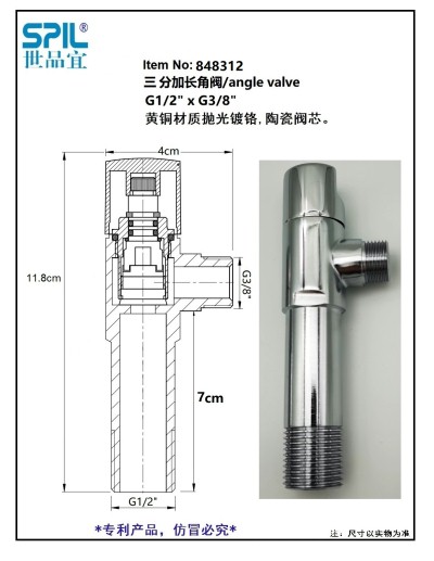 3分加长角阀 点击放大 公司名称:上海宜臻实业有限公司 产品型号:848312 产品简介:3分加长角阀,黄铜材质精抛镀铬 详细说明 4分转3分角阀,加长角阀 黄铜材质精抛镀铬,黄铜阀芯,陶瓷密封,快开阀芯